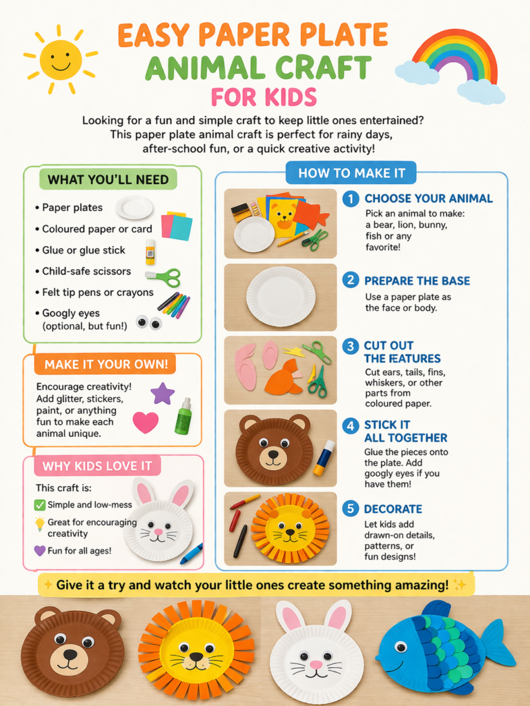 This easy paper plate animal craft is perfect for rainy days, playtime at home, or even a quick creative activity after school.